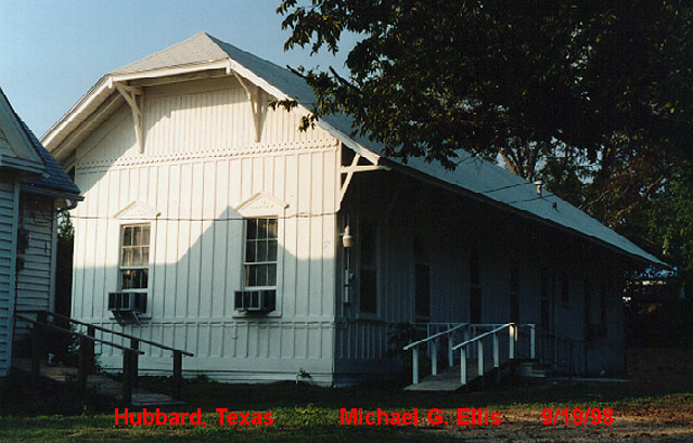 "When the I&GN pulled out its tracks from Malone, the depot was purchase by the St Albans Episcopal Church. The church had it moved to Hubbard (Ten miles south of Malone) and made it into a meeting hall for its congratulation. The church just painted the building this past summer (1998). The inside is in mint condition. Everything is still intact, even the metal benches are still inside."The church is now celebrating 100 years of servicing the community of Hubbard. "I haven't yet found out if this was a joint station for the Trinty & Brazos Valley / Internation & Great Northern or it just served the I&GN. E-mail me at "mgellis@hotmail.com" if you have any info." | |