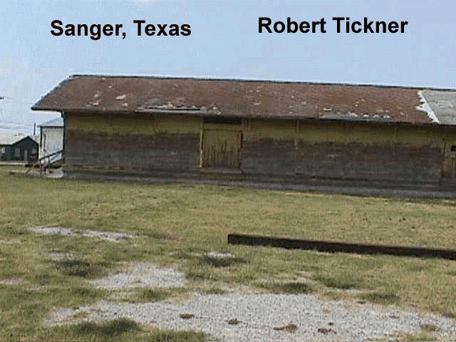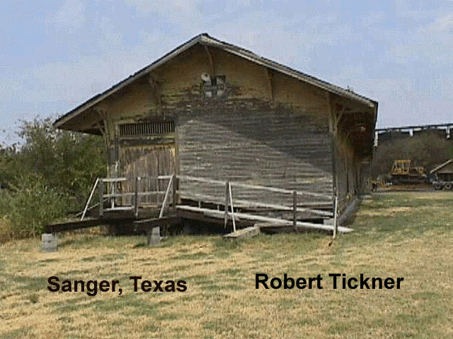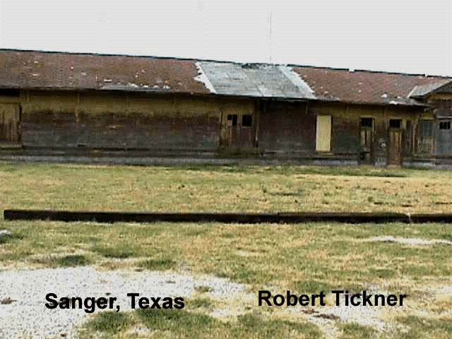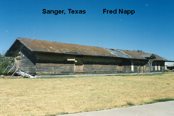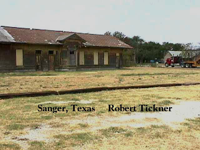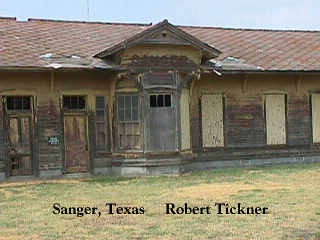 The Sanger,TX ATSF Depot is loaded up on wheels and ready to move. They have cut the building into two parts. The passenger section and the freight section. It is a fairly large structure of all wood. Should be interesting to see it going down the road, especially if it is going all the way to Tioga, Texas.The station was moved from the railroad property a number of years ago about a block from the tracks. The Moving company is the one from Ft. Worth that moved Tower 19. (Update - 8/99) - The Sanger GC&SF depot is on the south side of Tioga along US 377, 0.9 mi. south of the post office in Tioga, Gene Autry's birthplace. It's on the west side of the highway, between the road and the old T&P/M-K-T joint track (now Union Pacific). The two halves have not been unloaded and re-joined yet. The owner plans on making a bar/restaraunt out of the building. Submitted by Robert K Tickner, J.P.Hazelton & Harry R. "Bear" Brown | |