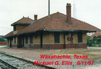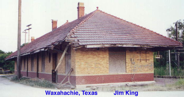 The city got the depot, but MKT and now UP refused to sale the land. The station is in bad shape, but the inside is ok. Part of the roof was ripped off when a semi got to close to the depot. The city has plans to restore it, but for now, Boyce Gin is renting it for their feed and hay storage.August 1998, The City of Waxahachie forced Boyce Gin to start on the extensive repairs on the ex-MKT Waxahachie depots roof. The lower quarter of the tile roof around the depot was REMOVED! The tiles were stack in bundles on the south side of the depot. Most of the lower rafters were exposed. The end that was ripped off by a feed truck did have a wooden beam supporting that end corner of the roof. The front of the station that faces the tracks, had stacks and stacks of new 1x4's laying there. Some of them were already nailed up onto the front face of the rafters. | |